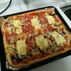 7. Put diced green peppers, diced onions, purple cabbage, and corn kernels , pine nuts, mushrooms, and sprinkle with a layer of cheese