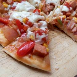 5.First spread tomato sauce on the cake, then put the fried ingredients, and finally sprinkle a layer of cheese on top