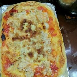 4.Use a fork to cross the bottom of the dough with many small bumps densely in the middle, so that when baking process will not increase.After the dough has rested for 15 minutes, first spread some tomato sauce, then spread the cheese, then put the fished shrimp, chicken and salmon on top, then put two slices of cheese on top, and bake in the oven for 15 minutes.