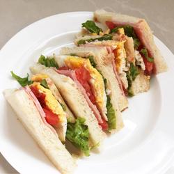 5. Spread the tuna on the toast slices, and place lettuce, fried eggs, tomatoes, and ham in order., and finally covered with a piece of white toast.