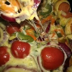 9. Place the fried vegetables on top of the pizza, and then cut it in half Place the small tomatoes on top.