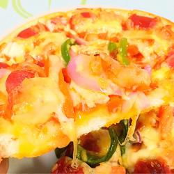 11.In the middle of the pizza plate Spread a layer of cooked tomato sauce, sprinkle with a little cheese, and evenly top with marinated shrimp.(Peel and devein the shrimp, season with cooking wine, light soy sauce, and pepper to marinate)