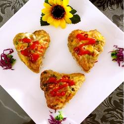 7. Brush the cake mold with oil, add the fried vegetables, and evenly pour the egg juice.