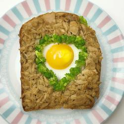 5.Crack an egg into the recessed area and break it into the pressed bread! Put it in the preheated oven and bake it at 180 degrees for about 12 minutes!