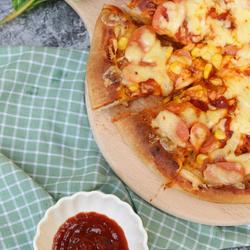 12. Continue to spread half of the mozzarella cheese, which can be melted after heating.Then put corn, sausages on top one after another, and if there are vegetables, put vegetables on top.You can brush a ring of egg yolk or salad oil on the outer ring of the pizza.The color is nice and attractive when baked