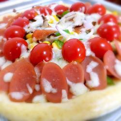 4. Brush with egg liquid, spread pizza sauce evenly on the pizza, and then sprinkle 50 Gram cheese, and then put the vegetables on top.Don't spread it too full or too thick, otherwise it won't be cooked properly.Place in the oven at 200 degrees and bake for 15-20 minutes.