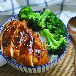 8. Cut the chicken steak diagonally into strips and place it on the rice~