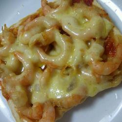 4.Put the pickled shrimp on the toast, top with cheese, and a simple pizza is complete!