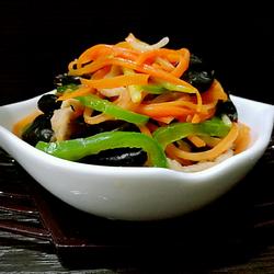 2.Tear the soaked fungus into small pieces, peel the carrot and cut into shreds, green pepper Shred the green onion into sections and set aside.