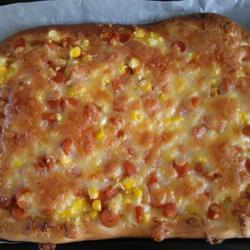 2.Dough (Put milk into the bread machine, put salt and sugar in the diagonal corners, pour in flour, make a small hole in the middle with your fingers, put yeast in it, start the kneading program and knead for 15 minutes.In the middle, add softened butter after the flour forms, and continue kneading into a smooth dough.Cover with plastic wrap and let rise for 15 minutes.Roll out thinly, slightly smaller than the pizza pan.