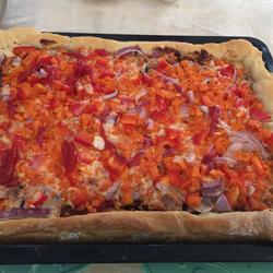 Flour, yeast powder, milk, tomato paste, cheese ( ) | Bacon, red peppers, carrots, onions ( ) |
