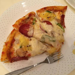 3. First brush a layer of pizza sauce on the dough, and then surround it with a layer of pizza sauce Circle the cheese sticks, then layer with onions, mushrooms, green peppers, pineapple slices, and finally the risotto slices.Sprinkle some pepper and pizza seasoning.