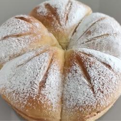 3.After it has risen, use a strainer to sprinkle a small amount of powder and use a knife to draw petal patterns.(I accidentally sprinkled too much flour)