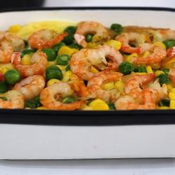 5. Pour the egg milk liquid into the baking bowl, add the toast strips and compact them, and spread the green beans and corn kernels.Top with arctic shrimp.