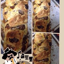 • 2. Add red dates to the dough, knead the dough into long strips , cut into 9 pieces, roll three into a long strip, braid, decorate, and brush the surface with eggs.