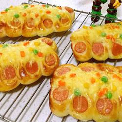 9. Take it out when it is fermented to 2-2.5 times in size.Preheat the oven to 180 degrees for ten minutes! Brush the surface of the bread with egg wash and add mozzarella, green beans, carrots and corn kernels.