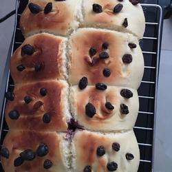 3. Take out the dough and divide it into small pieces.Let it rest for 15 minutes.Wrap the dough with mulberries in mulberry wine to make a filling.Place it in a baking pan and continue to ferment in the oven until it doubles in size.