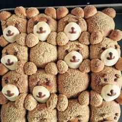 1. I forgot to take a picture of the bread and dough.Put the main dough except butter and all the ingredients into the bread machine in the order of the liquid flour particles below.(The Bear Bread Maker I use) Start the dough kneading program.After the dough is formed, cut it with scissors a dozen times so that the film can come out easily.Then add butter softened at room temperature and knead the dough for 15 minutes.Finally, start the dough rising function.Ferment until 2.5 times in size.Poke the middle of the dough with your finger.If it does not shrink back, it means the fermentation is successful.Then divide the main dough into 96 grams for ears and eyebrows, cover it with plastic wrap, and divide the rest into 16 pieces of 29-gram dough for the body, and divide the ears into 32 pieces of 2.7-gram dough, leaving some for eyebrows.Make 12 small pieces of 8g dough in Okpi.When you're done, start making them in rows.Decorate the ears and eyebrows.After decorating the ears and eyebrows, place them in the oven for secondary fermentation for 30 minutes.Then use a sieve to evenly sprinkle the soybean flour onto the Teddy.The body of the bear must be even.Finally, dip a little water into the nose and put it on the bear's face with eyebrows.