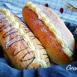 8. Let cool, cut a slit in the middle, do not cut it, squeeze on the light cream, be sure to whip the light cream before Refrigerate, add sugar to create a texture, put it in a piping bag, and then squeeze it into the middle of the bread.You can also squeeze chocolate sauce on the surface of the bread