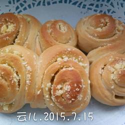 4. Put all warm water, oil, sugar, salt, 2 tablespoons of whole egg liquid and high-gluten flour Put it into the bread machine bucket, dig a small hole with your fingers, put the active yeast into the small hole, turn on the power and release program and dough block and start kneading the dough for half an hour