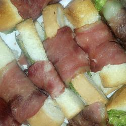 3.Put lettuce in the bacon and roll it up with bread sticks, with the interface facing down