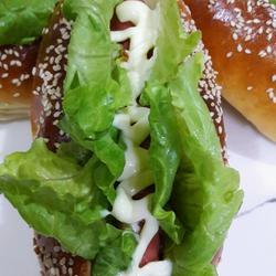 16.Cut the cool bread in the middle, add a piece of lettuce, and squeeze tomatoes on it Sauce, then add a piece of ham sausage, and finally squeeze salad on top, and the hot dog bun is ready.