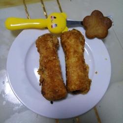 6.Put the rolled bread in and beat well In the bowl of eggs, evenly coat with egg liquid