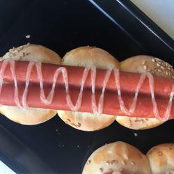 7. Place it in the fermentation box to rise for about two hours, brush the surface with egg liquid, put the intestines and a piece of intestines Separate it from the middle and garnish with salad dressing