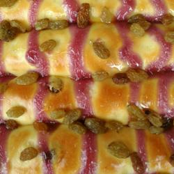 3.Roll out the dough, spread it with sauce, sprinkle with raisins, roll it into a stick shape and put it on the baking sheet