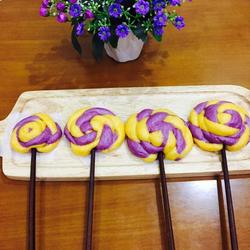 7.Take out a small piece of purple sweet potato starch and yellow sweet potato starch and shape into strips