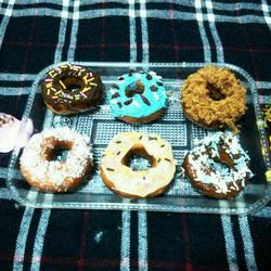 15.Cut some white and blue chocolate chips and put them on the drizzle On the donuts with black chocolate noodles, they are still quite beautiful.