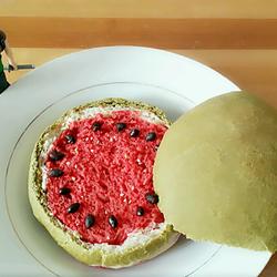 15.Place the prepared chocolate beans in a circle around the watermelon flesh and garnish with some white sesame seeds as immature watermelon seeds