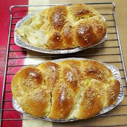 3. After the dough mixing process is over, it will take about an hour and a half.Take out the dough and divide it into two parts.Roll one part of the dough into an oval shape and evenly distribute the coconut paste.Sprinkle it on top