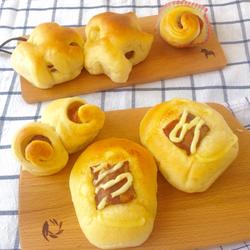 9. After fermentation, preheat the oven 175 degrees.Brush the surface of the bread with egg wash, bacon, and squeeze salad dressing.