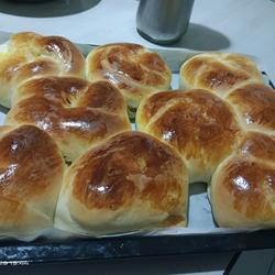 4. Take out the proofed bread and brush it with a thin layer of egg yolk liquid , preheat the oven in advance to 145 degrees, lower the heat to 145 degrees, and bake the middle layer for 20 minutes.(