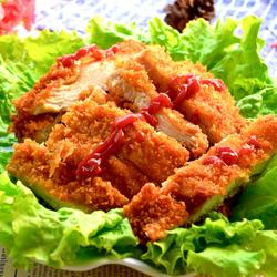 14. Cut the oil-controlled chicken steak into strips, put it on a plate, and put an appropriate amount on it Tomato sauce, crispy on the outside and tender on the inside, salty and delicious fried chicken is ready, please take your time.