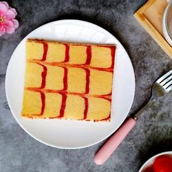 9. Line a baking sheet with oiled paper, pour in the cake batter, and use a spatula to smooth it out.bubble.Put the red yeast cake batter into a piping bag and pipe it on top of the cake batter.Use a chopstick to draw it down from the top, making sure the spaces are evenly spaced.