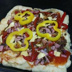 9. Add a little oil to the pan, put the cake, roll up the edges a little, until golden brown After that, turn over, add oil, sear it, then turn it over, apply tomato sauce, put some cheese, then put the vegetables that have been fried in advance, then put the ham, and then put a layer of cheese.Finally, cut the remaining bell pepper (I used yellow) into rings for decoration.