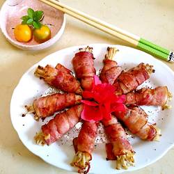1. Remove the ends of the golden needles, wash them and set aside.Roll up the bacon and use toothpicks to secure the seal