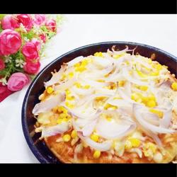 11. Brush the dough with a layer of pizza sauce and shaman cheese at a time, and then put Serve with corn kernels and onions.