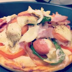 3. Brush the pancake with tomato sauce, place a layer of cheese and vegetables layer by layer, and sprinkle some pepper