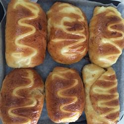 2. The fermented dough is deflated, divided into small portions, and allowed to wake up Let it rise for 15 minutes, take a small amount and roll it into a rectangular shape, put the apple filling in the middle, roll it up from one end and place it on the baking sheet, cover it with plastic wrap and let it rise for the second time until it doubles in size ( About an hour), brush the surface of the fermented bread with whole egg wash, and use a pastry bag to squeeze on the salad dressing.