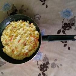 4. Heat the oil in a pan, pour in the mixed egg liquid, and turn to low heat during the frying process ( Evenly on low heat), cover the whole process with a lid, turn off the heat when the egg liquid on top is full and there is still a little moisture, don't open the lid in a hurry, open it after two or three minutes, and finally you can take it out of the pot~(≧ ▽≦)/~