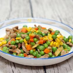 4. First stir-fry peas and carrots, add water and cook briefly, add corn and meat cubes and stir-fry, add salt to taste, sprinkle with chopped green onion and serve.
