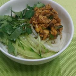 6. Boil the noodles, take them out and cool them with water.Add the egg sauce with cucumber shreds and coriander., mix well.