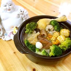 8.Add broccoli in turn (if you want it to be crispy) You can add it last), abalone, scallops, fish maw, vermicelli, sea cucumbers, quail eggs, fresh shrimps, mushrooms