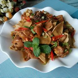 5. Add the chicken pieces and stir-fry for a while, add salt, sugar and dark soy sauce Stir evenly