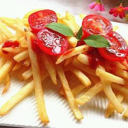 6.Pour a little into the fryer Heat more oil until cooked, put in the frozen French fries and fry on low heat for 3 minutes, take them out and fry again for another minute, take them out of the pan and sprinkle them with salt while they are still hot, and dip them in tomato sauce.