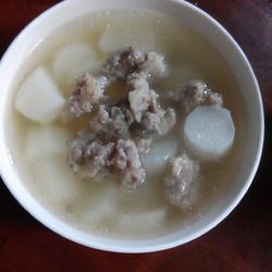 2. Peel the radish, wash it, cut it into pieces that are not too thick, put the radish in the pressure cooker, put water in the pressure cooker, and then put the meatballs Go in, put a little salt before cooking so it won't taste bad