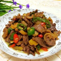 7. When the peppers are half cooked, add the fried donkey meat and continue to stir-fry until the peppers are half cooked.Cut off life.
